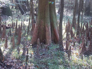 The above picture may seem a bit weird, but it was the only way I could show the forest canopy. The forest canopy is said to be taller than any other deciduous forest on Earth. Giant sweetgum, tupelo, ash, elm, along with several species of oak and hickory, form the canopy. Along the boardwalk were also loblolly pines which, according to the information we had, stood from 150 to 167 feet high, some being 200 years old or more. We also saw a bald cypress which was 27 in. circumference. It was easy to readily identify the cypress trees because of their base which grows wide, to anchor the tree in the mud. Their "knees",which in the park can be up to 7 1/2 feet high, could be seen everywhere on the forest floor.